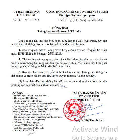 Thứ ba, 20/01/2026 | 21:08 A- A A+ | Thông báo về việc treo cờ Tổ quốc Chia sẻ Đọc bài Lưu Thông báo treo cờ chào mừng Đại hội đại biểu toàn quốc lần thứ XIV của Đảng